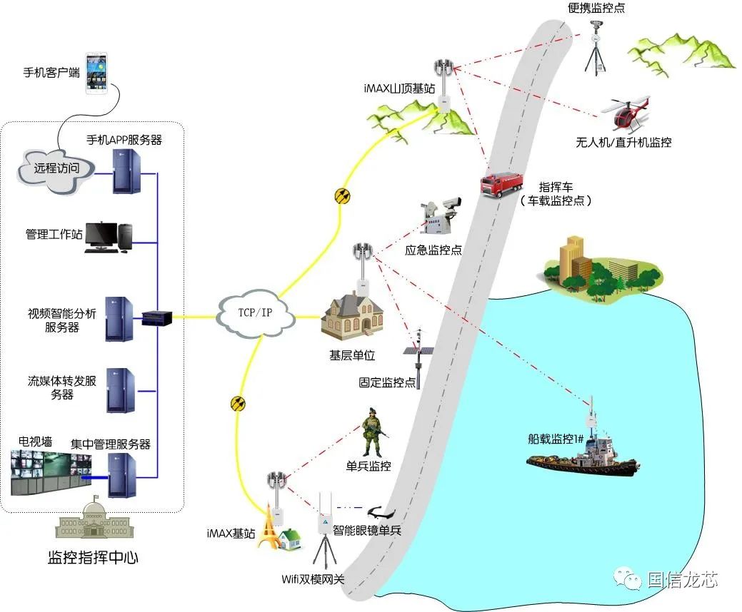 Among them, vehicle-mounted (shipborne, airborne) surveillance points support real-time mobility, featuring fast moving speed and emergency deployment; portable mobile video surveillance point systems and movable surveillance point systems are customized products developed by Guoxin Longxin according to specific user needs, serving as a powerful supplement to fixed-point surveillance systems; the individual soldier system mainly realizes local storage of real-time images and audio from frontline disaster relief staff, and real-time network transmission within the coverage of iMAX wireless base stations or 4G/5G networks.