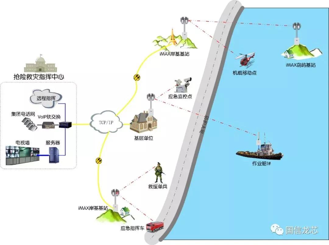 Guoxin Longxin’s Remote Integrated Command Solution for Disaster Relief and Emergency Management, based on the iMAX wireless MAN and Huanyou low-frequency MESH system, can meet the emergency command and disaster relief needs of various scenarios. The application topology diagram is shown below: