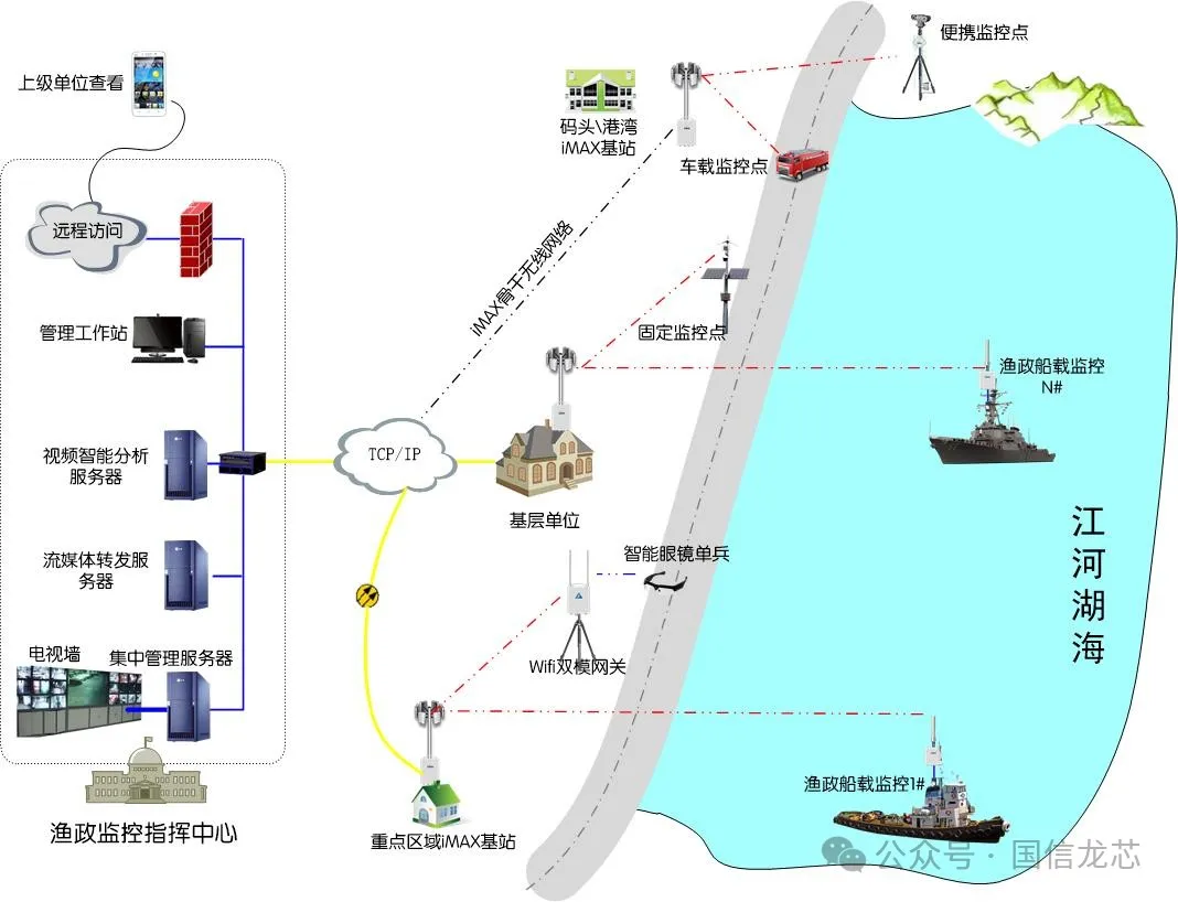 Fishery law enforcement monitoring points consist of fixed monitoring points, ship-borne monitoring points and portable mobile monitoring points, all of which can achieve network interconnection via the iMAX Wireless Metropolitan Area Network system.