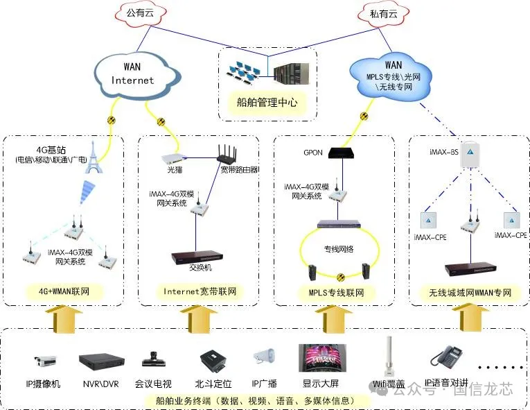 It should be emphasized that the above two solutions are not mutually exclusive, but can be integrated to complement each other’s strengths and offset weaknesses. Guoxin Longxin’s 4G dual-mode wireless gateway iMAX-4GW300 is an integrated product that simultaneously enables inter-vessel private network connectivity and 4G public network access.