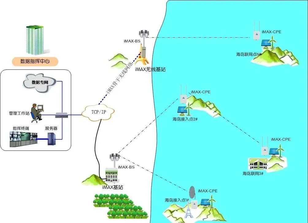 Taking the construction of an island wireless metropolitan area network as an example, the typical application topology diagram of the iMAX WMAN is as follows: