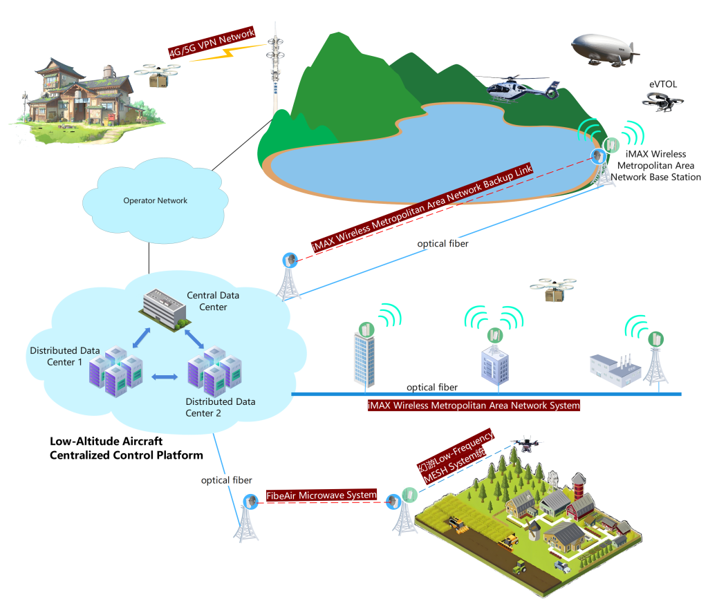 - Access Network: Deploy a large number of small Huanyou low-frequency MESH system base stations (for UAVs) or iMAX wireless metropolitan area network base stations (for larger low-altitude aircraft) in low-altitude areas to form a cross-coverage access network, providing reliable communication access for low-altitude aircraft. These base stations adopt low-power consumption, high-gain, and long-distance design, which can effectively expand the signal coverage range, reduce the number of base stations to be erected, and effectively lower the investment. Low-altitude aircraft can realize interconnection with base stations as long as they are equipped with corresponding on-board terminals.