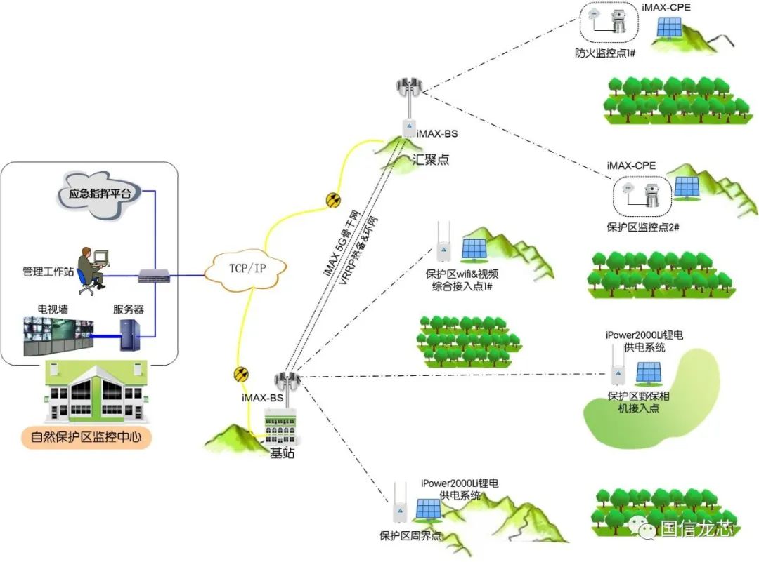 Combining years of experience in wireless networking for field areas in scenic spots, parks, water conservancy, petroleum and other industries, Guoxin Longxin has developed the most suitable wireless private network solution for wildlife protection in nature reserves. The core of the solution is the application of the iMAX 5G wireless metropolitan area private network: