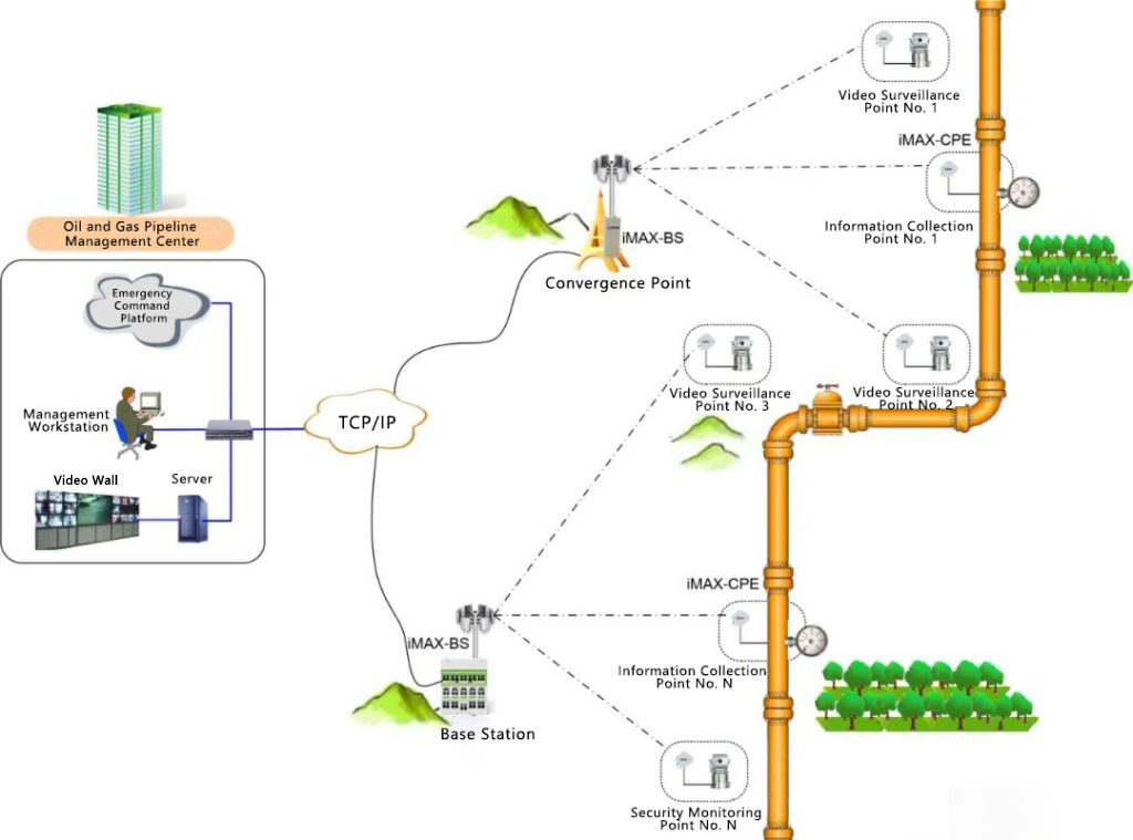 For the networking of monitoring points, a reliable, high-capacity, and long-distance dedicated network should be used. However, wiring around pipelines that cross high mountains, steep ridges, rivers, and lakes is very inconvenient. Therefore, wireless metropolitan area network (WMAN) technology is the best choice, and the 5G iMAX wireless private network system is the most ideal solution. This system features an extremely long communication distance, high reliability, strong confidentiality, and multi-purpose use of the private network, making it the first choice for building field private networks.