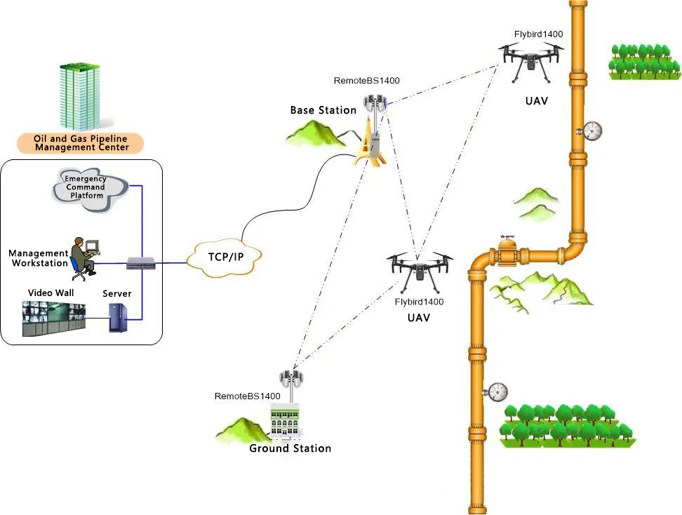 UAVs can be carried on dedicated patrol vehicles to complete aerial inspections of a section of area at one time and detect potential safety hazards in a timely manner. For communication between UAVs and patrol vehicles, the Huanyou low-frequency MESH mobile communication system can be selected. If an iMAX wireless metropolitan area network system has been built along the pipeline and connected to the monitoring and command center, within the effective coverage area of iMAX base stations, patrol vehicles can also connect to the network in real time, enabling the back-end command center to retrieve UAV images in real time.
