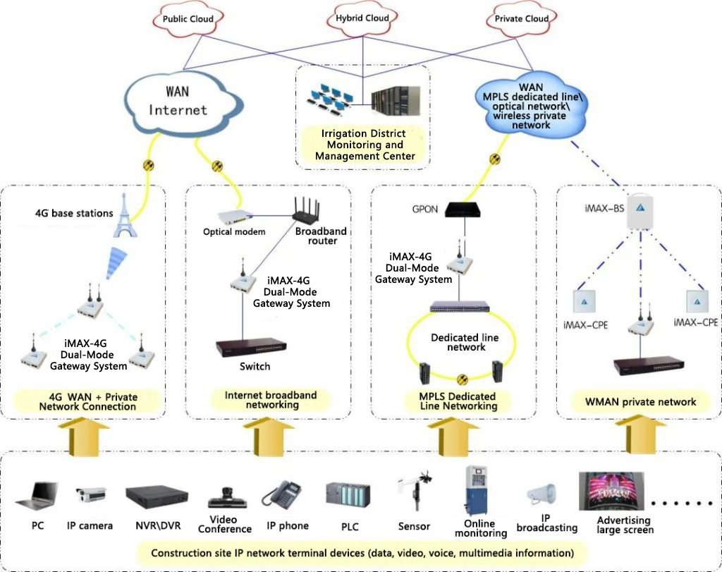 Networking for water conservancy project construction and operation management (including construction sites of water conservancy facilities) is characterized by scattered nodes, high bandwidth, large capacity, real-time transmission, temporary deployment and easy relocation, making the iMAX 5G Wireless Metropolitan Area Network system the optimal choice.